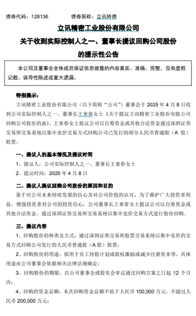 同时,立讯精密实际控制人之一、副董事长王来胜拟以自有资金通过深圳证券交易所系统增持公司股份。拟增持金额不低于2亿元,不超过3亿元,实施期限为自本增持计划公告之日起6个月内择机完成。